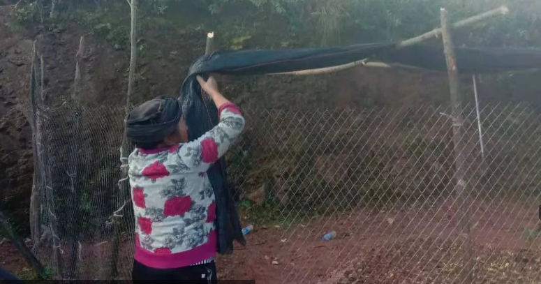 赵正康母亲在为高山杜鹃花幼苗搭建遮阴棚。(赵正康 2021年10月 31日 提供)
