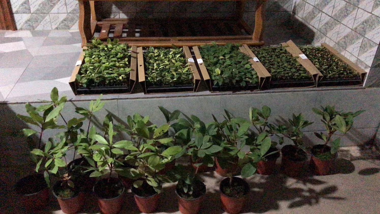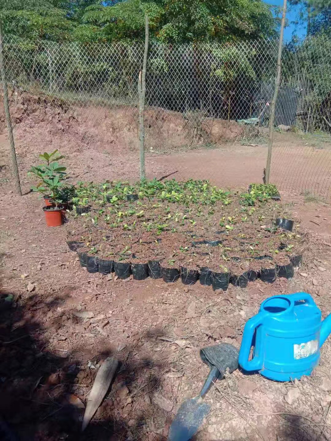 2021年10月22日21:00该批苗木运抵项目实施地漾濞县苍山西镇花椒园村委会大浪坝小组。穴盘苗5个品种(每个品种1盘,128株/盘)合计640株(照片前方盆栽杜鹃大苗3个品种共18株,为云南省农业科学院花卉研究所协调赠送村民试种)。
