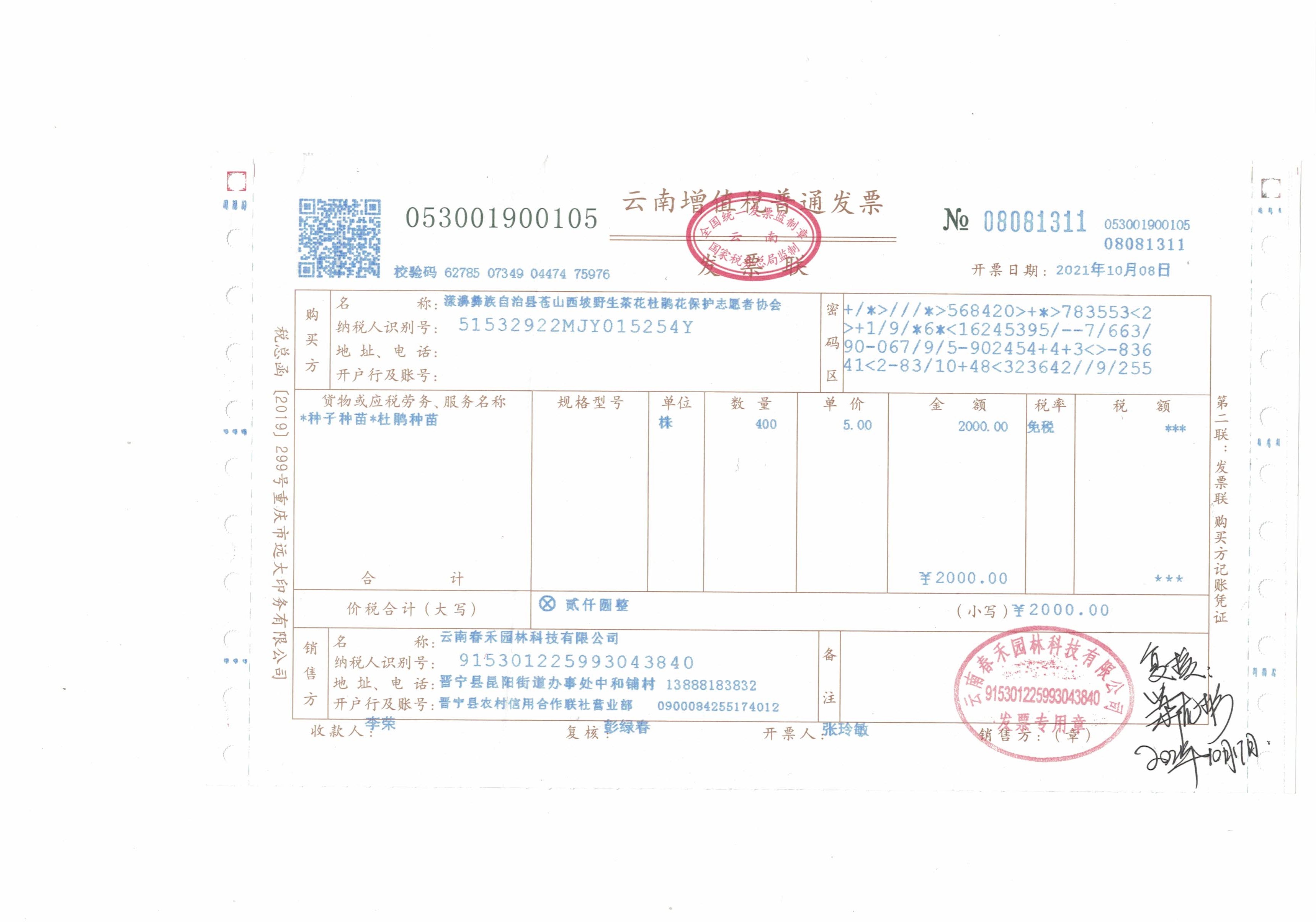 特别说明:申请书中对2000元使用分配如下:采购高山杜鹃花幼苗600株需1500元;建设“育苗圃”采购营养袋、围篱需300元;志愿者协助开展相关活动交通费等200元。因高山杜鹃花幼苗采购价格上涨,实际执行中将2000元全部作为购苗费用,其他费用如运输费、围篱、遮阴网等由漾濞彝族自治县苍山西坡野生茶花杜鹃花保护志愿者协会志愿者及农户承担。
