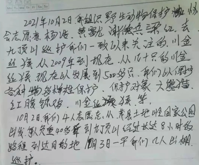 巡护志愿者的表达能力及电子设备有限,提供的部分报告内容是歪歪扭扭的手写材料,他们拿着很少的补贴,做着很辛苦的工作。感谢他们的付出。