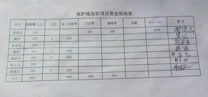 忇会志愿者4人巡山1次,为期2天,给予每人200元补助;给7人购买了意外保险,其中6人100元,1人200元;巡护生活开支300元,车辆加油200元;总开支2100元。