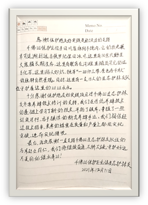 千佛山生态护林员对保护地友好资助的感谢