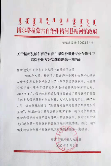 项目与保护地友好发展的相关性说明:2016年5月22日,精河县人民政府和中国生物多样性保护与绿色发展基金会授牌成立中华伊犁鼠兔保护地,2017年4月10日,中华伊犁鼠兔保护地志愿者队伍注册成为精河县纳仁郭楞自然生态保护服务专业合作社,简称天山精灵卫士。2022年2月,在当地政府支持下开始创建“新疆精河县伊犁鼠兔科普基地”。