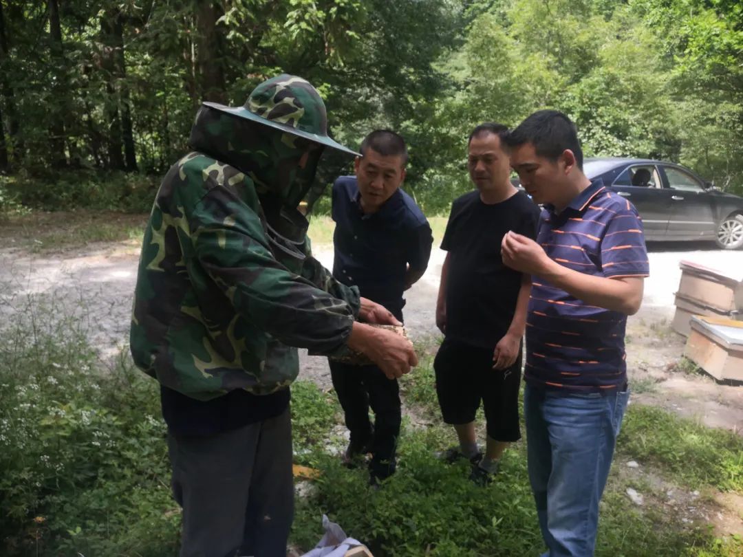 唐家河保护区管理人员在与蜂农交流养蜂工作